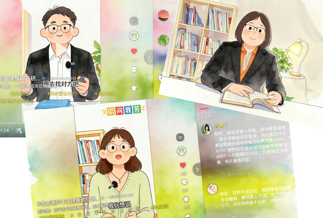 向社会普及未成年人法律保护知识是青少年中心多年来坚持的一项公益法律服务内容。去年,我们在自媒体平台发布了两条关于“孩子磕断牙齿类”纠纷如何解决的普法视频。相较于学生欺凌、性侵害、隔空猥亵等自带关注度的话题,“孩子磕掉牙”太小众了,以至于我们全然没有关注视频后续的传播数据,只当是为极少数有迫切需求的家长,提供一份实用的法律指引。