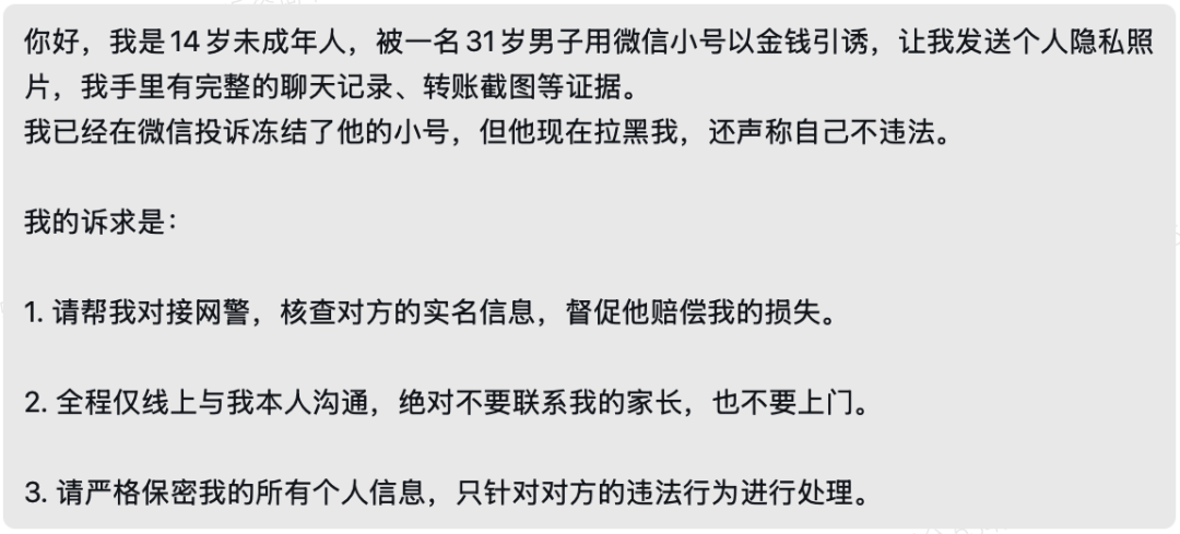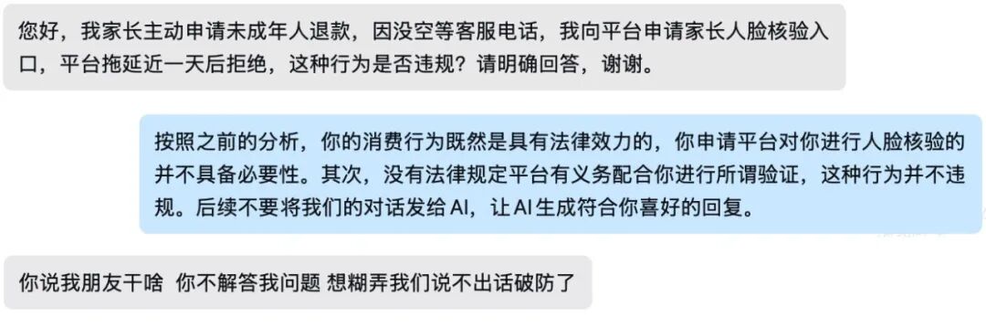AI给出的“完美回复”可能成为未成年人寻求司法、行政救济的主要依据。当未成年人拿着AI给出的“标准答案”去寻求学校、公安机关、教育行政部门等帮助时,一旦得到与预期不符的回应,可能引发对相关救济途径的误解和排斥,甚至引发事实认定错误、时效等重大法律风险。